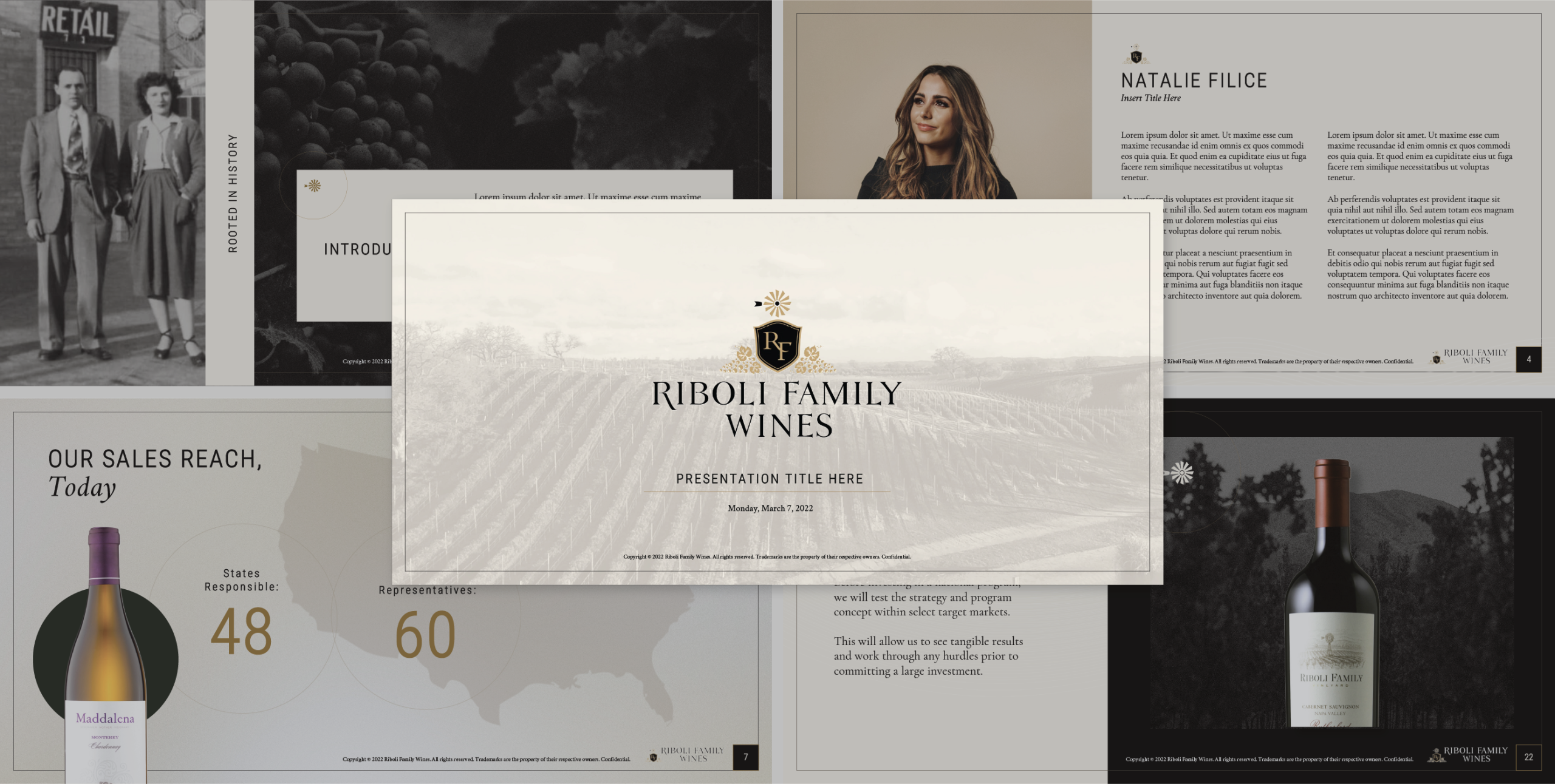 About: Riboli Family Wines, famous for their Stella brand, was looking to refresh their internal communications presentation. We utilized the brands colors and essence to create a sophisticated and timeless deck they could use for years to come.